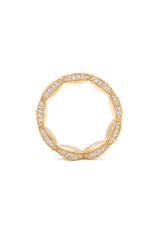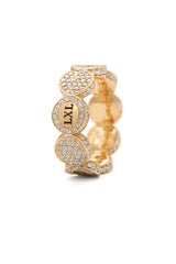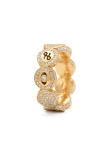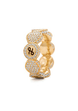 LXL fortune ring in 18K yellow gold with 1.75ct round cut diamonds on circular links. 324 stones over 9 classic LXL ingots measuring 8mm each. The fortune ring features discreet diamond evil eye.