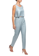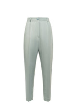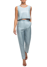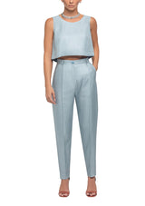 A classic high waisted trouser featuring a leg lengthening centre font pintuck and relaxed silhouette that tapers at the ankle. Lightweight and airy, the blue silk iteration of this trouser is perfect for a warmer climate. A true staple piece that pairs equally well with flats or heels. Wear it with the matching v back blouse for an elevated summer look or pair it with the pussy bow shirt for more coverage.