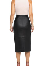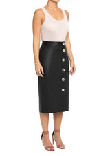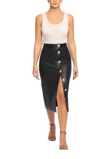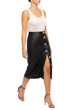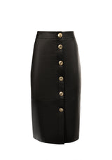 Simultaneously reserved and revealing, our leather pencil skirt allows you to change your split length in a second. A full button down creates a demure daytime look, and as the sun begins to set, the pop of a few buttons transforms the skirt into a sleek, thigh skimming evening piece. Soft, supple nappa leather, oversized gold LXL buttons and silk lining come together to create this luxurious wardrobe staple.