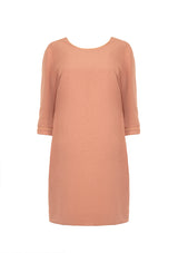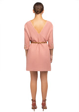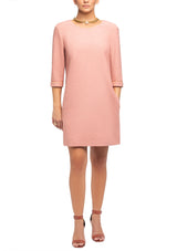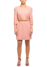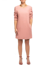 A subtle v back transforms this classic shift dress into a fun and feminine go-to piece. The summer weight boucle is finished with tonal leather trim at the neckline and cuffs, and gold LXL buttons adorn the 3/4 length sleeves.