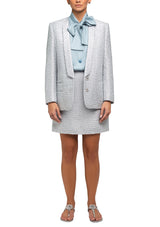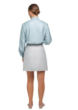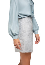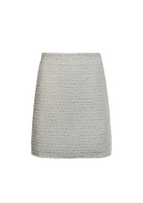 A high waisted, short hemlined skirt with a subtle a-line silhouette and invisible zip closure for an incredibly streamlined fit for all occasions. The silver tweed is simultaneously nostalgic and futuristic.