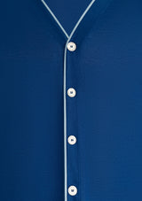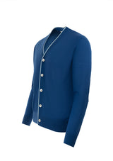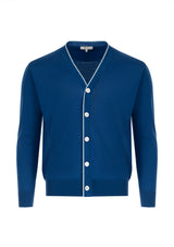 100% superfine cashmere v neck cardigan with soft, buttery, napa piping and elbow patches. Mother of pearl button closure. Perfect for layering over a shirt or t-shirt on a balmy evening on the boat for a contemporary interpretation of 1960's Thomas Crown swagger.