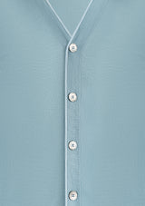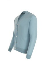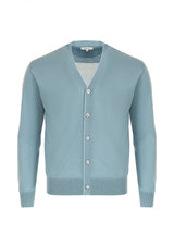 100% superfine cashmere v neck cardigan with soft, buttery, napa piping and elbow patches. Mother of pearl button closure. Perfect for layering over a shirt or t-shirt on a balmy evening on the boat for a contemporary interpretation of 1960's Thomas Crown swagger.